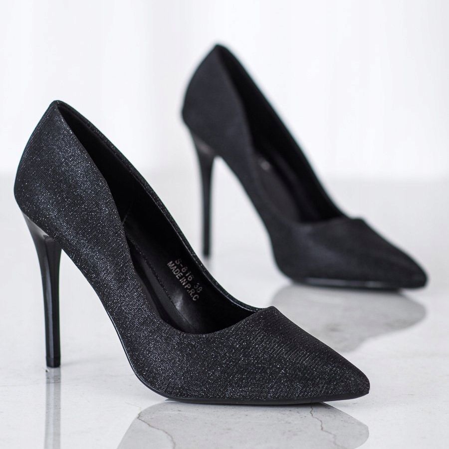 Mustissa glitterillä varustetut korkokengät on teräväkärkinen, mikä on ominaista muotimaailman muodikkaimmille tyyleille. Käytännöllisyyden takaa se, että nämä ovat slip-on malleja, mikä helpottaa kenkien pukemista ja riisumista nopeasti.
