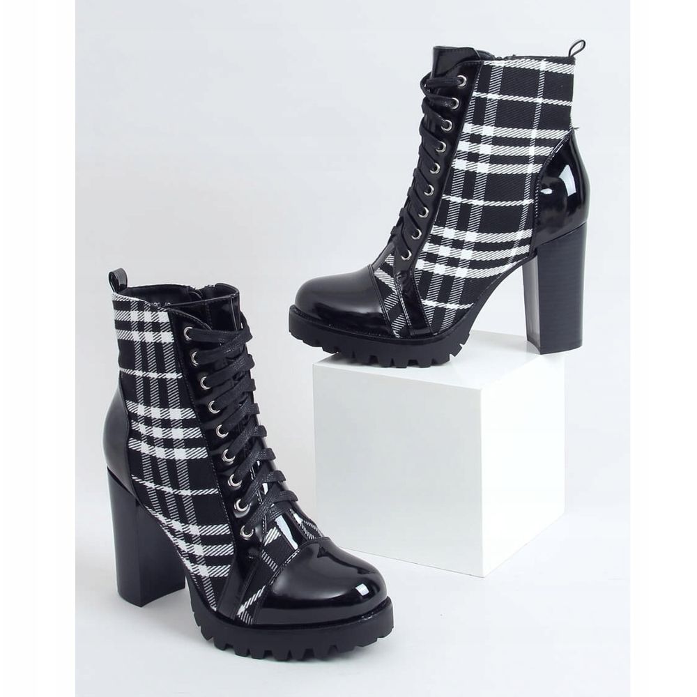 Niiden ainutlaatuinen ulkonäkö johtuu muodikkaasta ruudullisesta kuviosta ja lakatuista lisäosista, jotka herättävät huomiota ja antavat kengille omaperäisyyttä. Perinteisen nauhoituksen ja päällisen sivussa olevan käytännöllisen vetoketjun ansiosta näiden saappaiden pukeminen ja riisuminen on puhdasta nautintoa. Kenkien sisäpuoli on vuorattu herkällä turkilla, mikä takaa lämmön ja mukavuuden koko päivän.