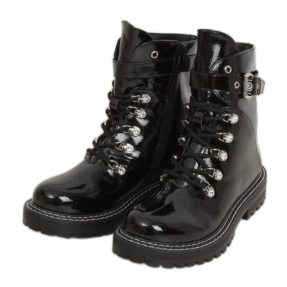 Tutustu naisten mustiin patentoituihin saappaisiin 8120-PA Black - ihanteellinen tarjous muodin ystäville, jotka haluavat erottua joukosta! Näissä nauhoitettavissa nilkkurit ovat yhdistelmä eleganssia ja ylellisyyttä, ja niiden kiiltävät kivet silmukoissa lisäävät ainutlaatuista luonnetta. Lakattu viimeistely tekee niistä paitsi houkuttelevia myös käytännöllisiä, täydellinen jokapäiväiseen ulkoiluun.