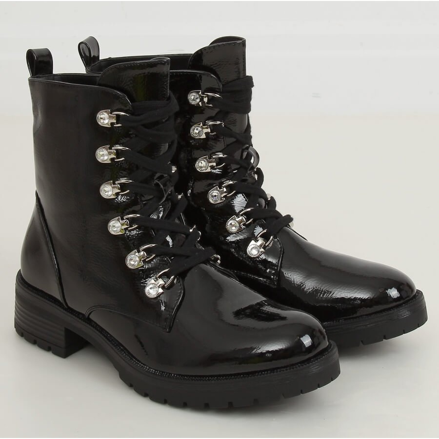 Löydä ainutlaatuiset mustaksi lakatut bovver-saappaat 7982-PA Black - täydellinen valinta naisille, jotka haluavat erottua joukosta. Näissä nauhoitettavissa nilkkureissa yhdistyvät ylellisyyden rohkeus ja elegantti tyyli, ja niiden kiiltävät aksentit nauhoja koristavien kivien muodossa herättävät huomiota ja lisäävät luonnetta mihin tahansa tyyliin.