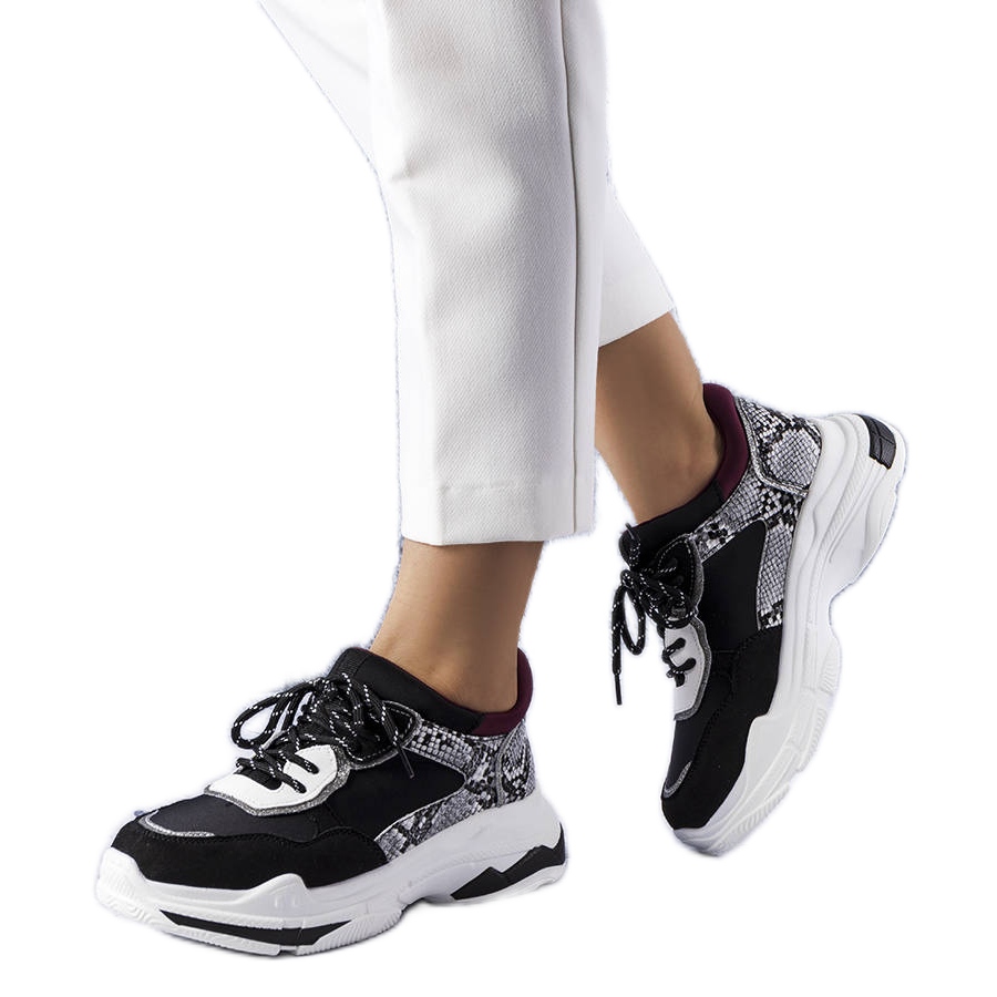 Modernit, mustat lenkkarit paksulla, ravitsevalla pohjalla, joka yhdistää rento ilmeen kaupunkityyliin. Matala ylempi koristeltu ompeleella ja kontrastisilla inserteillä ja hienovaraisella painikkeella on kengän luonteen, ja nauhoitus varmistaa jonkin verran sopivuutta.