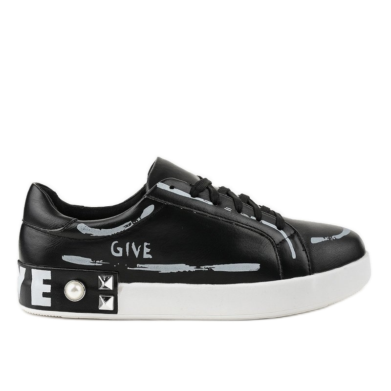 Päällisen musta väri erottuu valkoisista printeistä, jotka lisäävät hieman tuoreutta ja nykyaikaisuutta. Kengän takana on neppareilla koristeltu kangasnauha, joka antaa niille luonnetta ja korostaa niiden omaperäisyyttä.