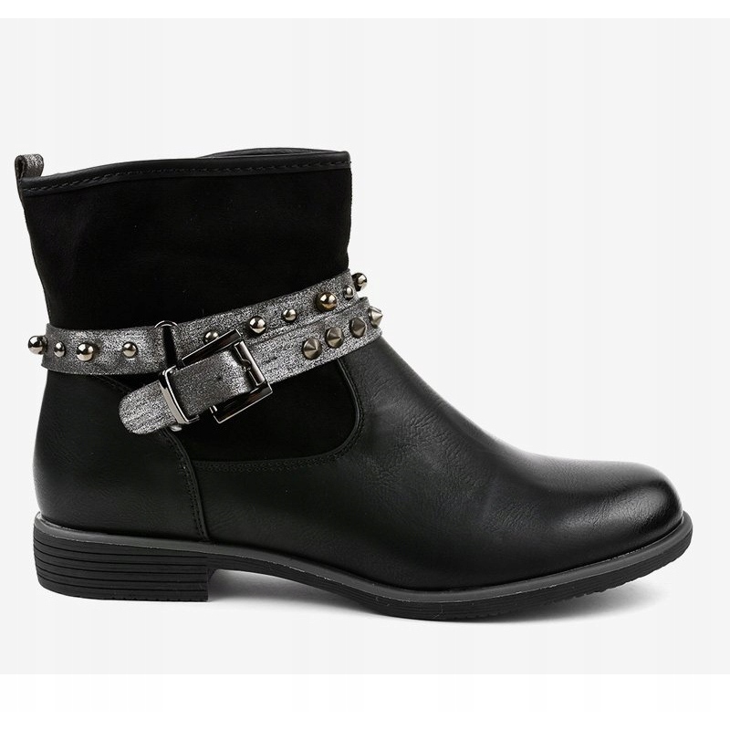 Saappaissa on pieni, leveä kantapää, 3 cm korkea, mikä tekee niistä täydellisen valinnan pitkille kävelyille ja jokapäiväiseen käyttöön. Vetoketju helpottaa pukemista, ja koristeelliset soljelliset olkaimet ja strassit antavat kengille ainutlaatuisen luonteen.