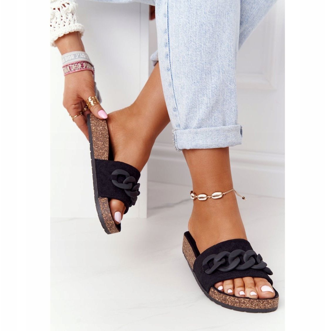 Nämä varvastossut erottuvat hienovaraisesta koristeellisesta ketjusta, joka lisää niihin tyylikkään korostuksen, joten ne sopivat täydellisesti eri tyyleihin. Slip-on-kiinnityksen ansiosta niiden pukeminen ja riisuminen on nopeaa ja kätevää. 3 cm korkea synteettinen pohja varmistaa vakauden ja iskunvaimennuksen, mikä tekee jokaisesta näissä varvastossoissa vietetystä hetkestä puhdasta nautintoa.