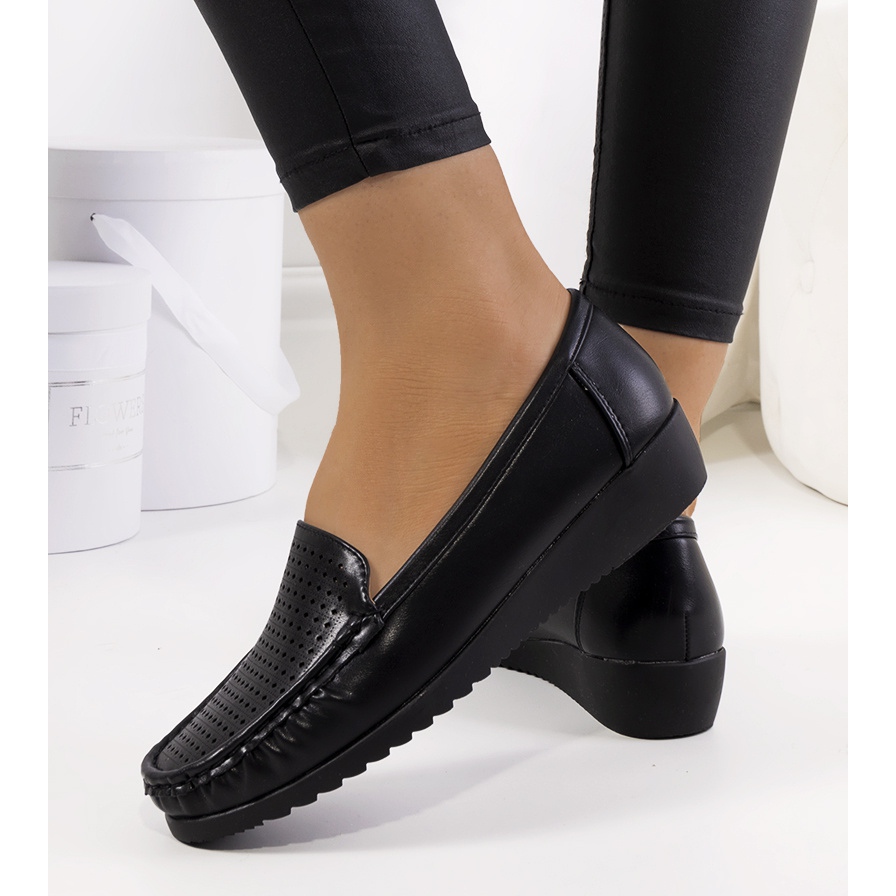 Mustat Dalal wedge mokasiinit ovat loistava valinta kevätpäiviin ja täydentävät täydellisesti mitä tahansa tyyliä. Nämä tyylikkäät naisten kengät erottuvat laadukkaasta ekologisesta nahasta valmistetusta päällystä, joka on koristeltu tyylikkäällä harjakattoisella kuviolla, joka lisää niihin keveyttä ja omaperäisyyttä.