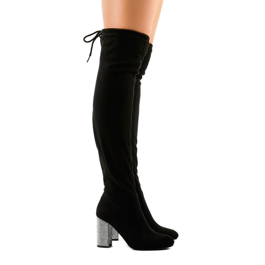 Polven yläpuolelle ulottuva korkea päällinen lisää eleganssia mihin tahansa tyyliin ja saa jalat näyttämään ohuemmilta. Lisäksi kantapäässä olevat strassit lisäävät hieman kiiltoa antaen kengille alkuperäisen luonteen.