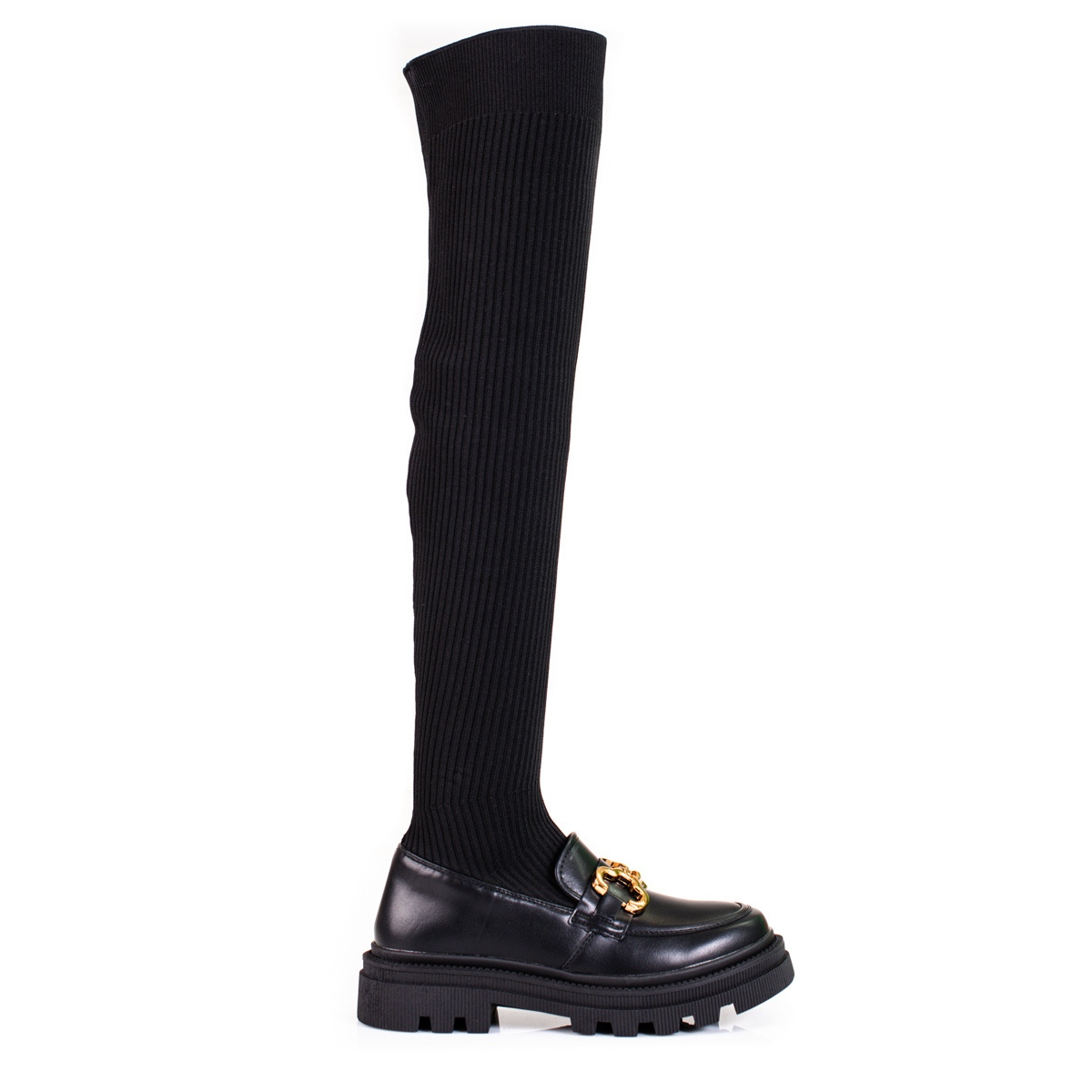 Tyylikäs, supra -kidmal naisten saappaat, jotka on valmistettu korkealaatuisesta ekologisesta nahasta ja kankaasta (yläosa: 50% ihon jäljittely, 50% tekstiilit). Malli, jolla on klassinen leikkaus pyöreällä, täydellä nenällä ja joustava yläosa, joka varmistaa sopivuuden ja mukavuuden käytettäessä. Koristeellinen ketju lisää luonnetta ja korostaa illan, joka on muodikas kengän luonne.