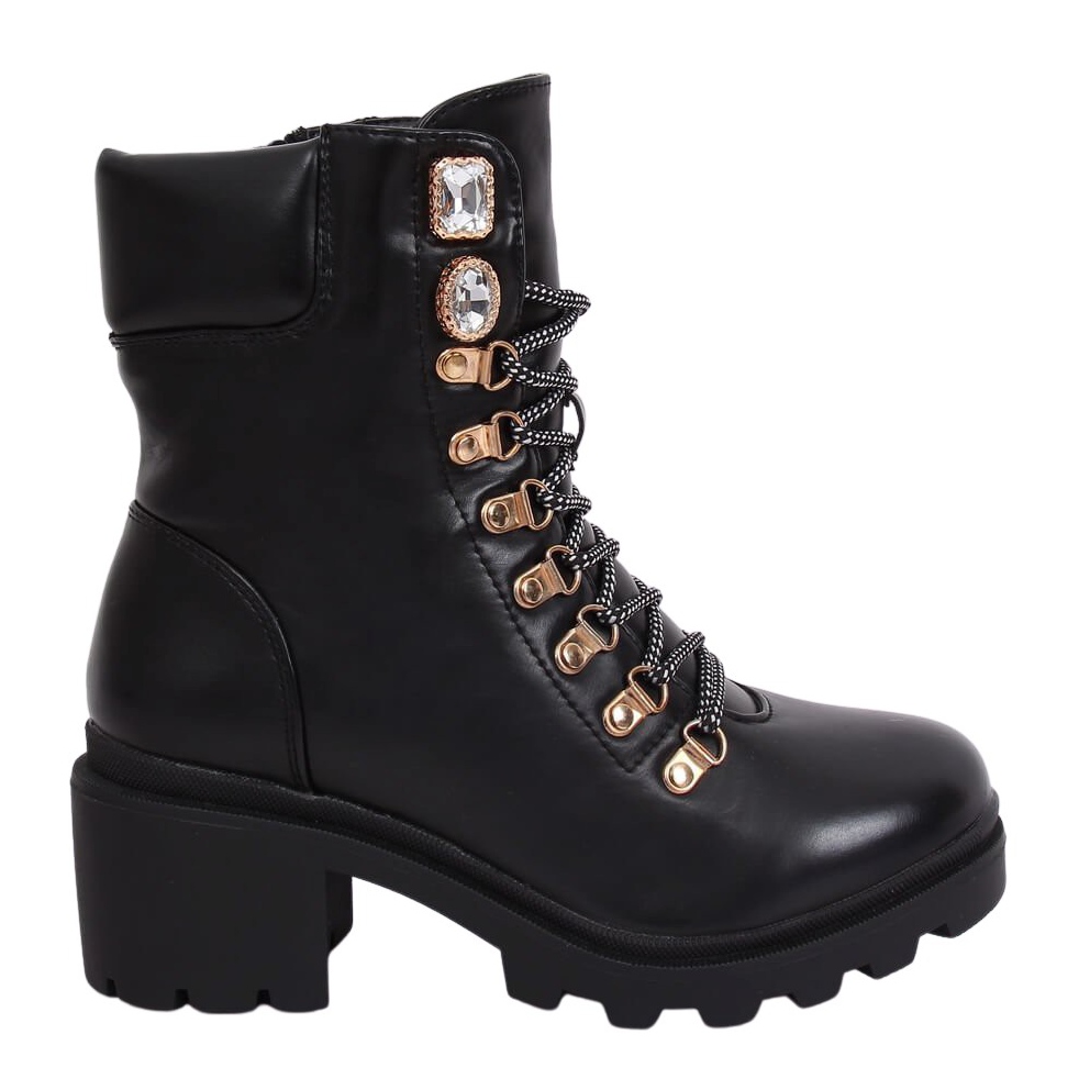 Löydä kauden uusin hitti - naisten mustat bovver-saappaat HE110 Black, jotka täydentävät täydellisesti jokapäiväistä tyyliä. Näissä erittäin muodikkaissa työntekijöiden kengissä, joissa on leveä, 6 cm korkea kantapää, yhdistyvät mukavuus ja ainutlaatuinen tyyli. Niiden alkuperäistä luonnetta korostaa kultainen nauhoitus kontrastisilla nauhoilla, jotka tuovat energiaa jokaiseen lookiin ja päällisen yläosan kiiltävät kivet houkuttelevat katsetta ja luovat ainutlaatuista hehkua.