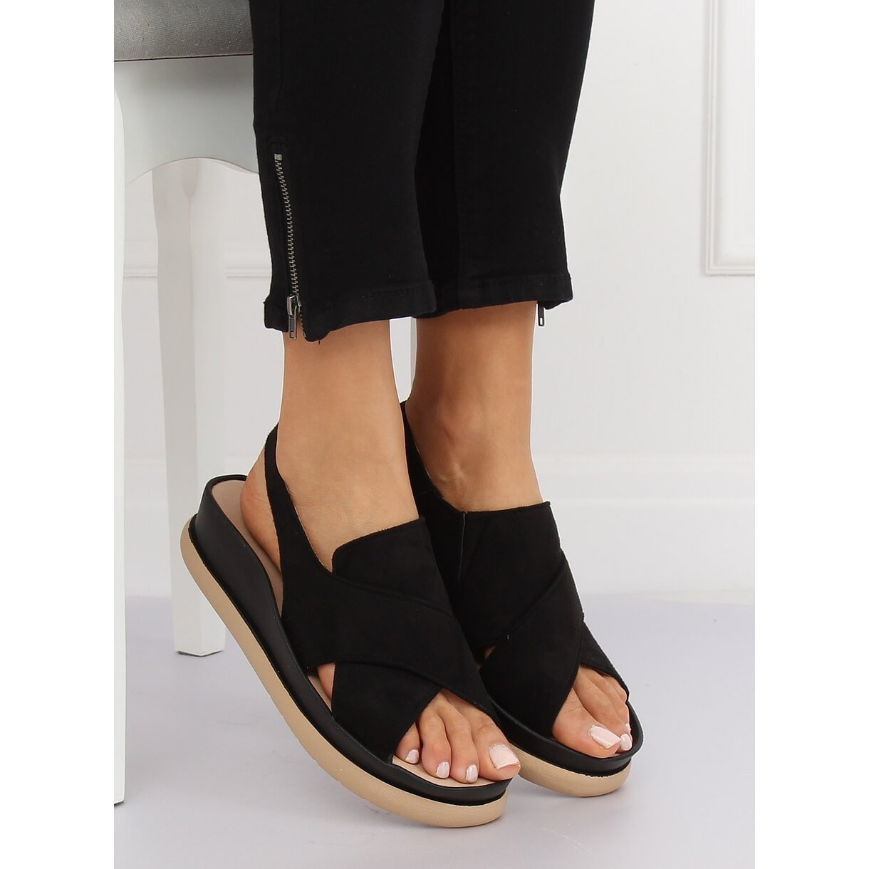 Niiden kumipohja tarjoaa erinomaisen iskunvaimennuksen, mikä tekee niistä täydelliset pitkille kävelyretkille rannalla tai kaupungin kaduilla. Pieni lisäys litteän kantapään muodossa (korkeus 4 cm) korostaa sandaalien alkuperäistä luonnetta ja risteävät olkaimet tukevat jalkaa tehokkaasti aktiivisuudesta riippumatta.