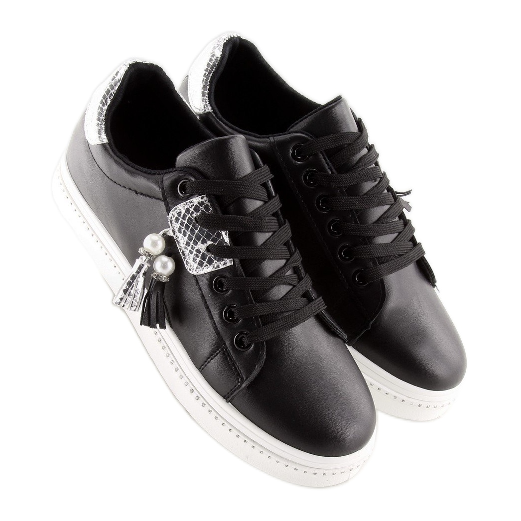 Löydä ainutlaatuinen tyyli naisten mustilla tennareilla 88038 BLACK/WHITE, joista tulee varmasti erottamaton osa vaatekaappiasi. Niiden klassinen leikkaus yhdistettynä muodikkaisiin helmillä koristeltuihin hapsuihin lisää ripauksen eleganssia mihin tahansa tyyliin. Hienovarainen viimeistely strassilla pohjan ympärillä lisää ripauksen glamouria, mikä tekee niistä täydelliset sekä arki- että tyylikkäämpiin asuihin.