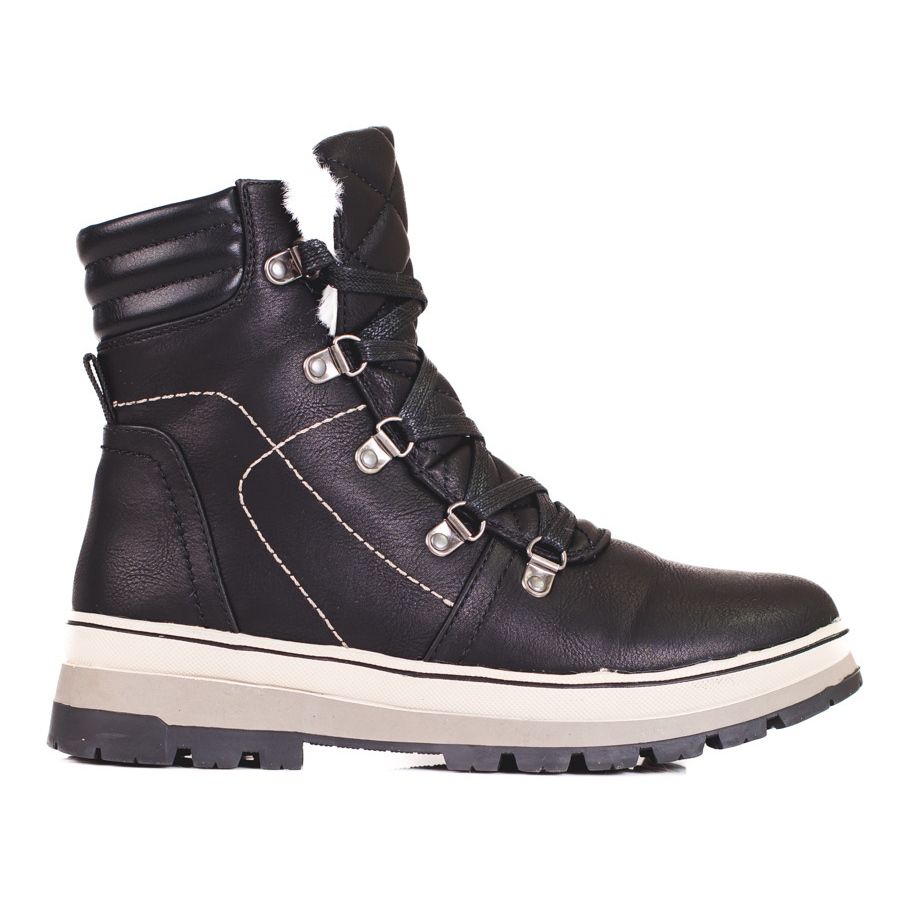 Mustat naisten ansaan eristyksellä - käytännölliset, mukavat ja tyylikkäät kengät viileämpinä päivinä. Ulkopuolelta, valmistettu ekologisesta nahasta, vuorattujen tekstiilien sisälle ja turkislehden sisälle ja varmistavat lämpöä ja mukavuutta jopa alhaisissa lämpötiloissa. Rakennettu -jäykistetty kantapää ja synteettisestä muovista valmistettu kiinteä pohja kulutuspinnan takaavan stabiilisuuden ja hyvän tarttumisen kaupunkien olosuhteissa. Nilkan malli, jolla on tasainen kantapää (3 cm), yhdistää täydellisesti urheilullisen hahmon päivittäiseen eleganssia.