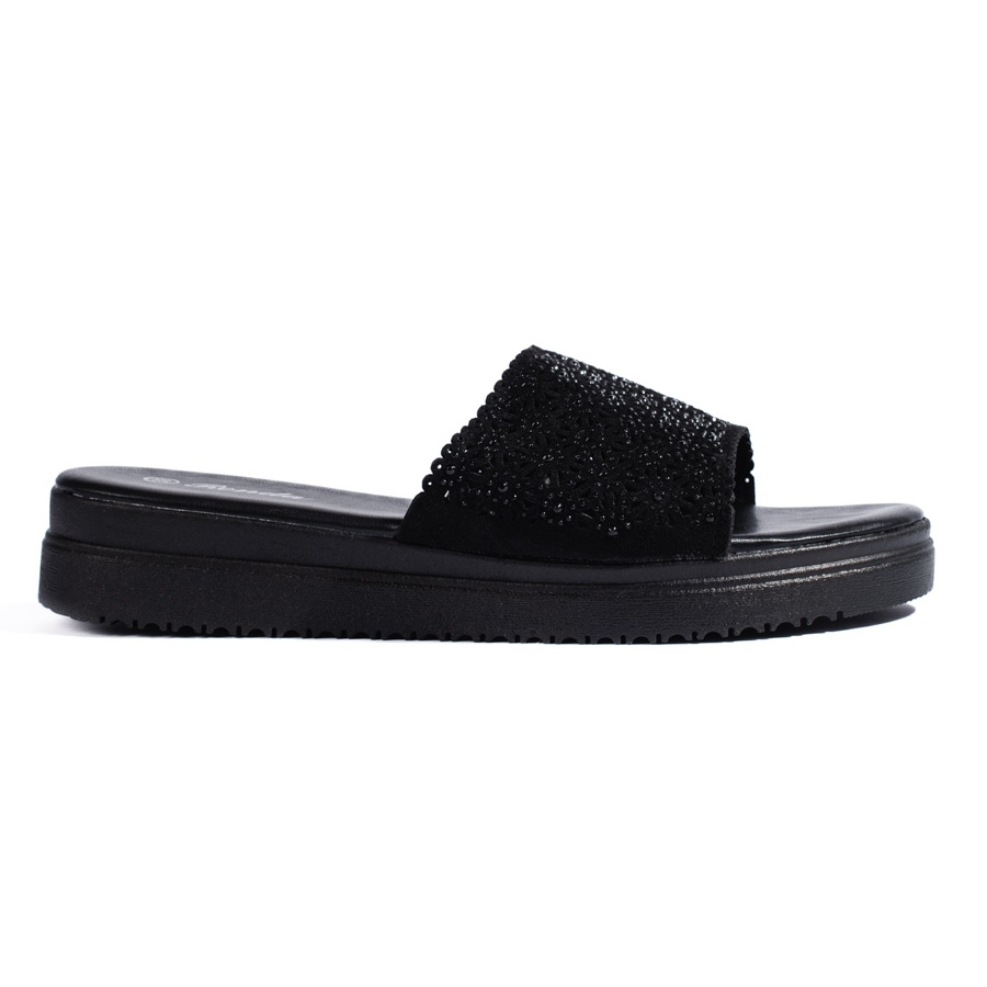 Nämä varvastossut on valmistettu korkealaatuisesta ekologisesta mokkanahasta, joissa on harjakattoinen viimeistely ja hienovaraiset strassit. Nämä varvastossut kiinnittävät huomiota ja lisäävät tyylikkyyttä mihin tahansa tyyliin. Avokanta ja slip-on-kiinnitys takaavat käyttömukavuuden, kun taas 4 cm korkea alusta takaa riittävän vakauden ja mukavuuden, joten voit nauttia jokaisesta askeleesta.