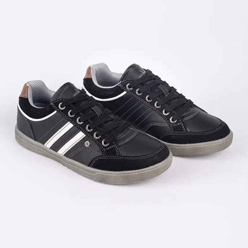 Pohja, jossa on muovista valmistettu kulutuspinta, tarjoaa tarttuvuuden, ja klassinen musta väri valkoisilla aksentteilla tekee kengistä universaalin ja helppo yhdistää muiden vaatekaappituotteiden kanssa.