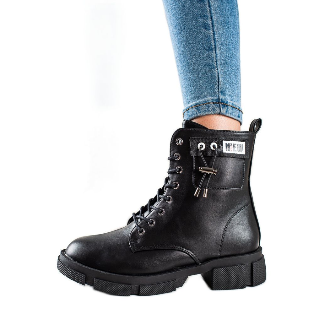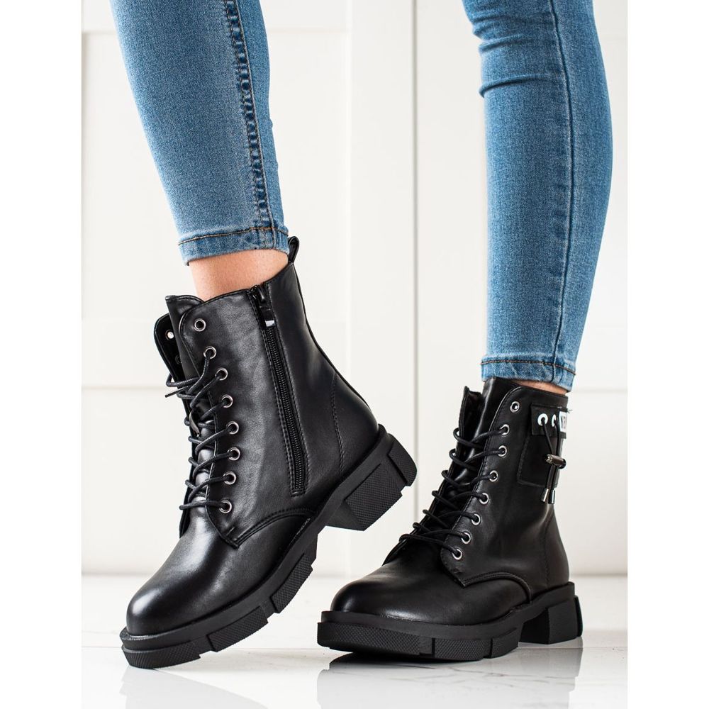 Mustat työntekijäsaappaat erottuvat koristeellisesta raidasta, joka tekee niistä alkuperäisiä ja erottuu joukosta. Pyöreä kärki ja 4 cm litteä kantapää takaavat mukavuuden pitkillä kävelylenkeillä, ja vetoketju ja nauhat helpottavat pukemista ja säätämistä jalkaan.