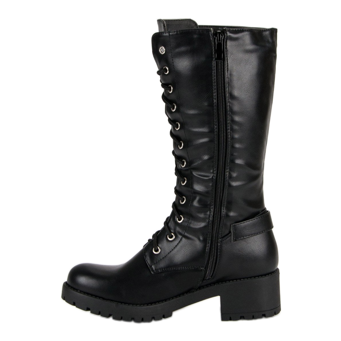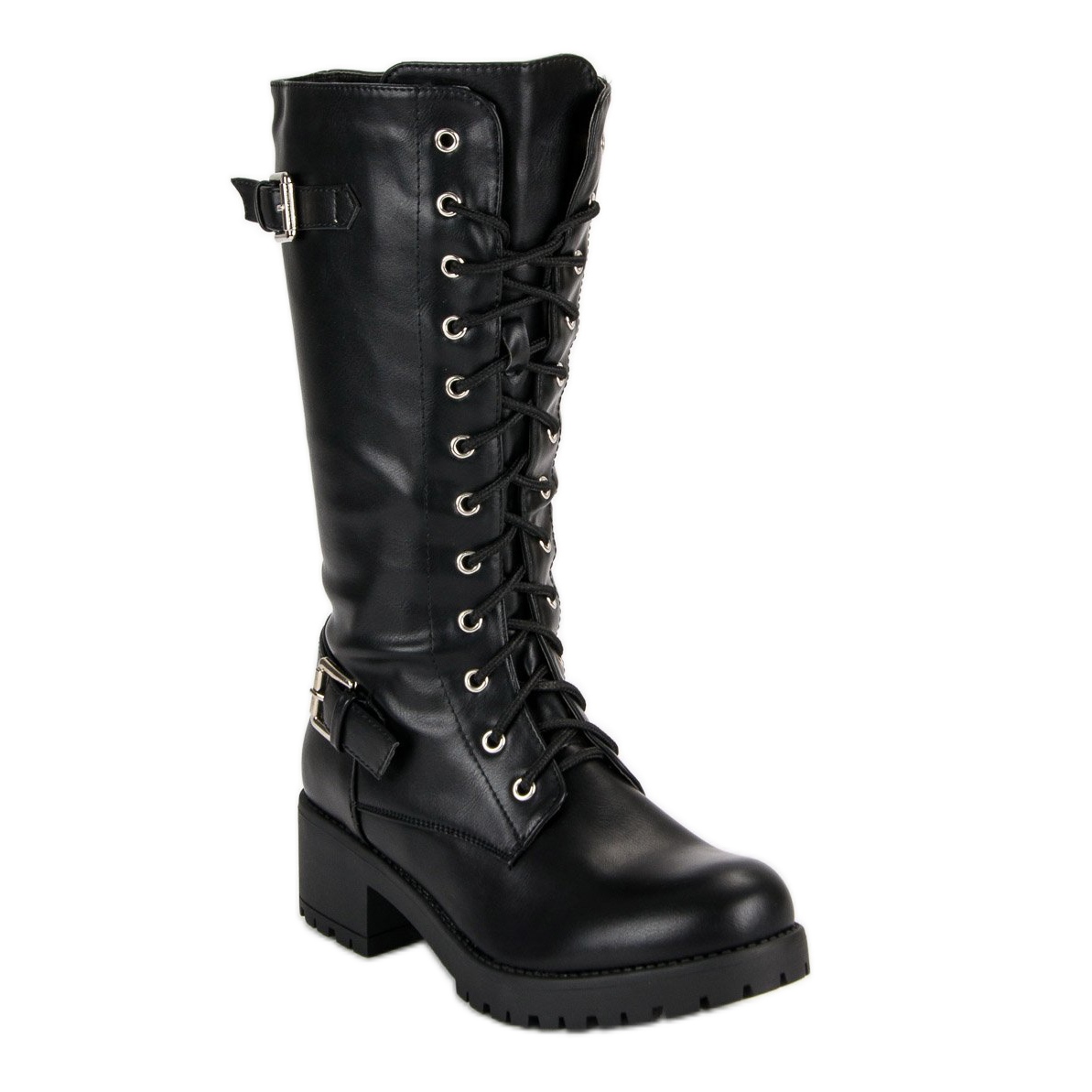 Mustissa saappaissa on käytännöllinen vetoketju ja nauhoitus, mikä mahdollistaa täydellisen istuvuuden mihin tahansa pohkeeseen. Lisäkoristeelliset olkaimet hopeisilla soljeilla antavat niille erottuvan, rohkean ilmeen, joka sopii täydellisesti naisille, jotka haluavat lisätä tyyliään.