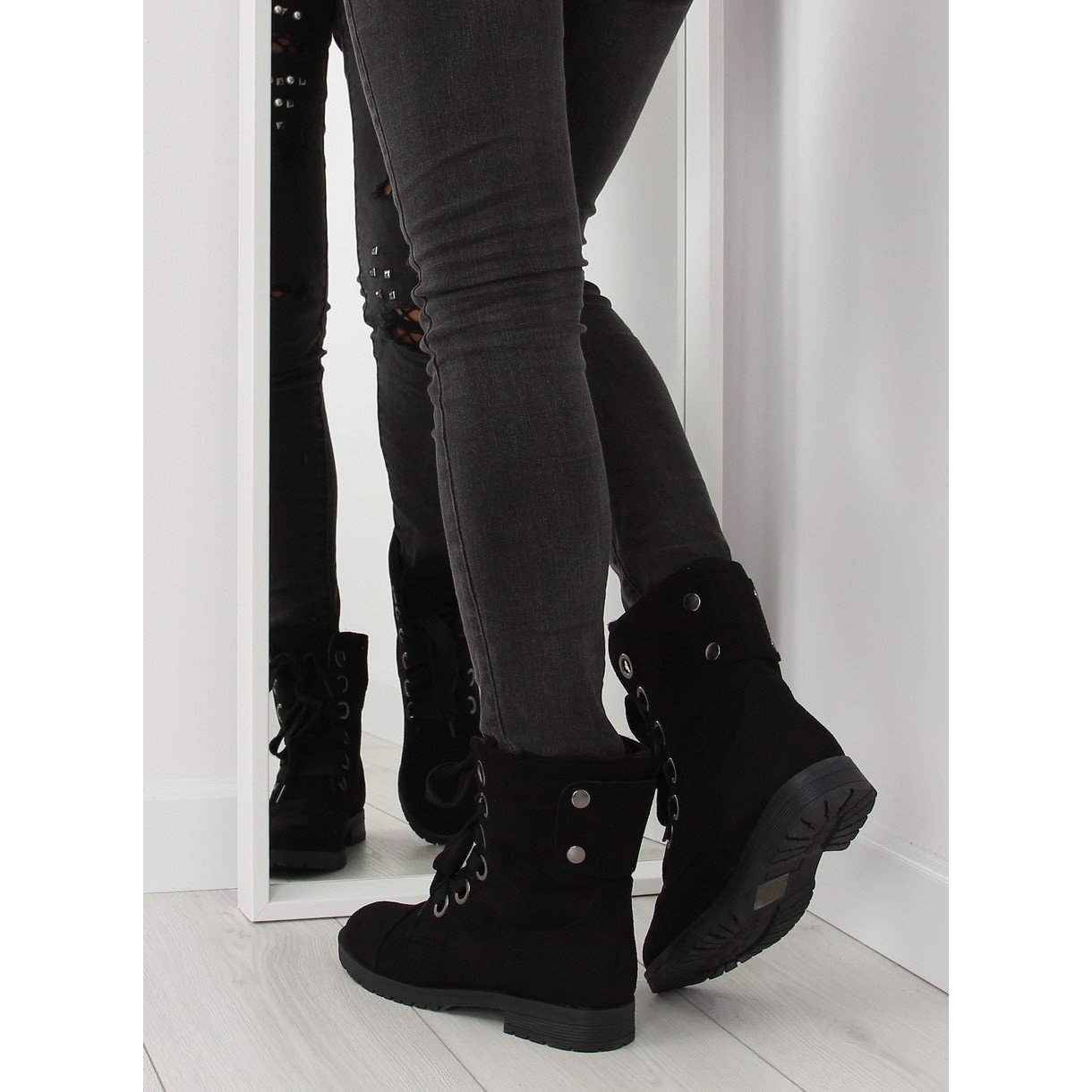 Päällisen takana on koristeellinen strassimerkki, joka korostaa niiden militaristista luonnetta ja lisää kokonaisuuteen viileää, rockia. Pyöreä kärki ja nauhakiinnitys takaavat mukavan istuvuuden, mikä tekee näistä saappaista erittäin yleismaailmallisen vaatekaappituotteen.
