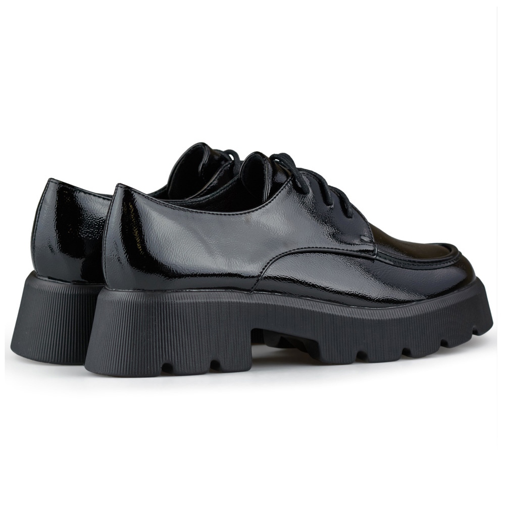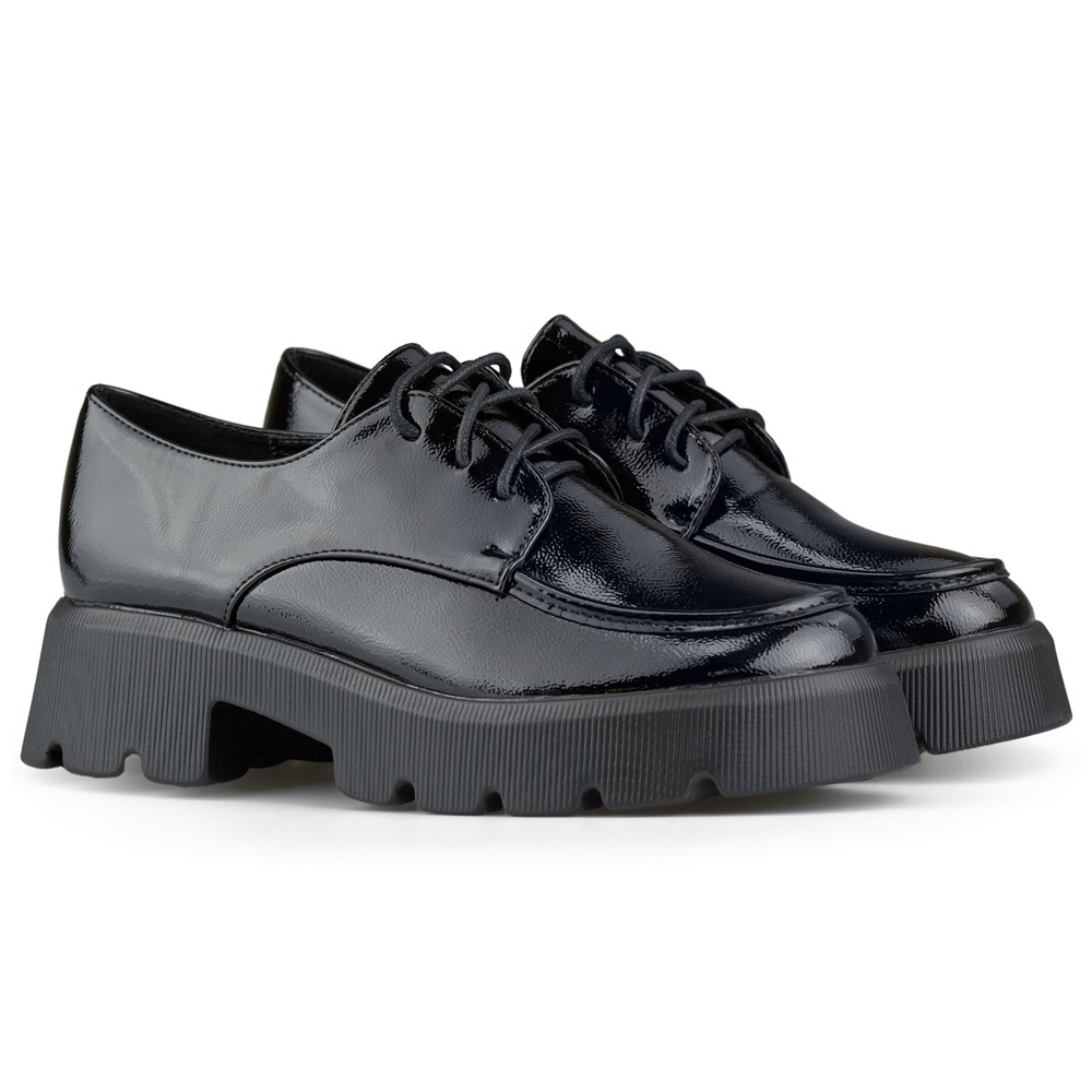 Yksityiskohdat: Mustat patentoidut nauhakengät, naisten kengät paksulla pohjalla