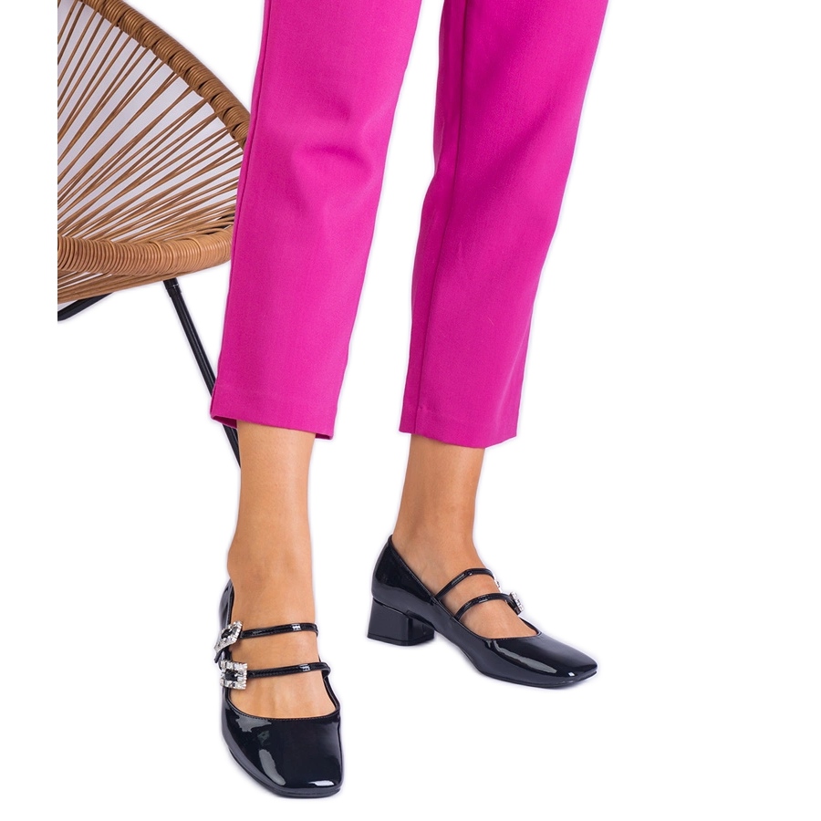 Yksityiskohdat: Mustat pumput, jotka on lakattu kiinnittimellä zirkonilla