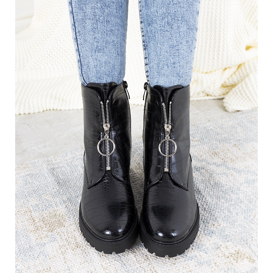 Parnellan mustat saappaat koristeellisella vetoketjulla ovat todellinen kauden hitti, joka kiinnittää varmasti jokaisen fashionistan huomion. Nämä kengät on valmistettu korkealaatuisesta eko-nahasta, jossa on tyylikäs krokotiilimainen rakenne, ja niissä yhdistyvät modernius ja klassinen tyyli.