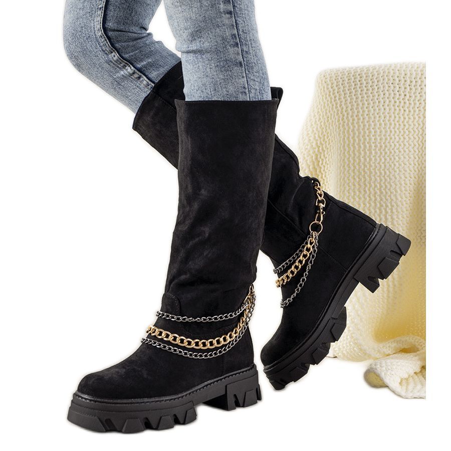 Black Saturday -saappaat ketjulla ovat erittäin tyylikäs valinta jokaiselle muodikkaalle naiselle. Nämä korkealaatuisesta ekologisesta mokkanahkasta valmistetut nilkkurit yhdistävät eleganssia moderniin muotoiluun. Päällistä koristava kultaketju antaa niille ainutlaatuisen luonteen ja sopii täydellisesti uusimpiin trendeihin.