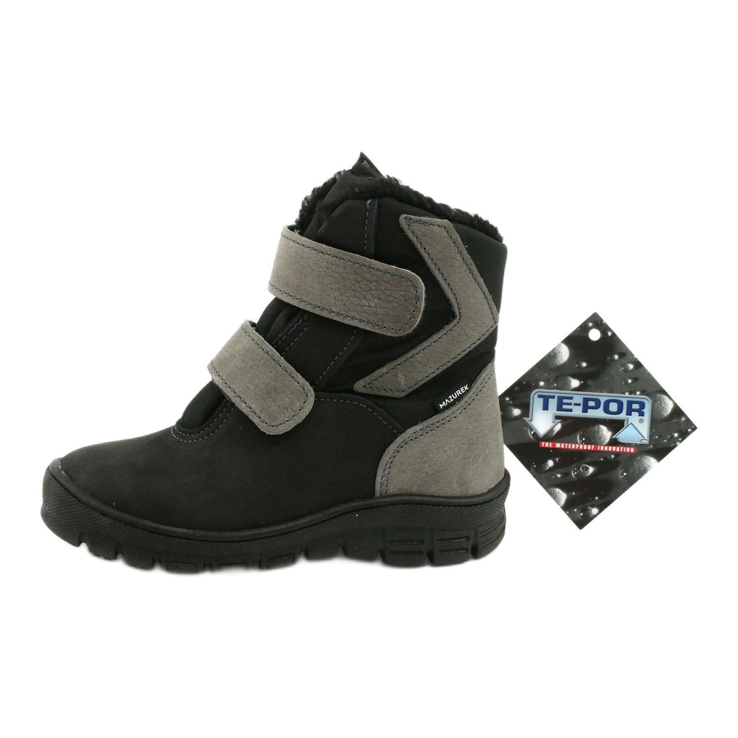 Mazurek 1351 -kalvosaappaat mustana ja harmaana ovat täydellinen ratkaisu aktiivisille pojille, jotka tarvitsevat mukavat ja toimivat kengät talvipäiviin. Korkealaatuisesta luonnonnahasta ja kankaasta valmistetut lasten kengät tarjoavat maksimaalisen suojan kosteudelta TE-POR-kalvon ansiosta, joka pitää veden tehokkaasti poissa.