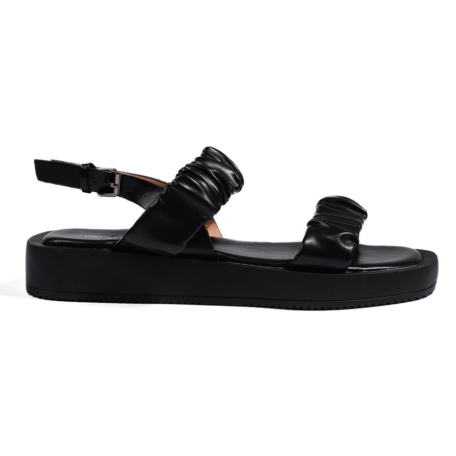 Ekologisesta nahkahoitoa valmistettu pohjallinen ja sisäinen materiaali hoitavat jalan mukavuutta, ja kiinteä, muovinen pohja varmistaa vakauden joka vaiheessa. Mustat sandaalit ovat ajaton vaatekappale, joka sopii hyvin tyylikkäisiin mekkoihin ja rentoasuihin.