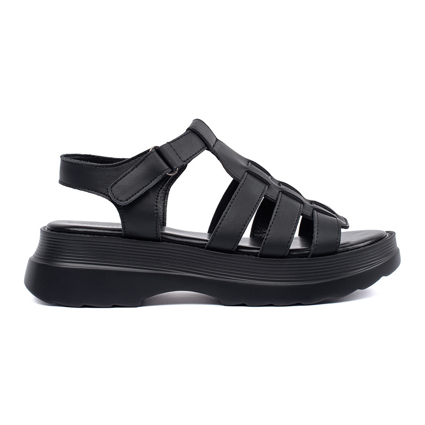 Kiinnittämällä tarranauhan, jalkineiden asettaminen on nopeaa ja helppoa, ja lisäksi voit sovittaa sandaalit täydellisesti jalan muotoon. Klassinen musta väri tekee tästä mallista täydellisesti sekoittumaan erilaisiin tyyliöihin - rentoun tyylikkääseen.