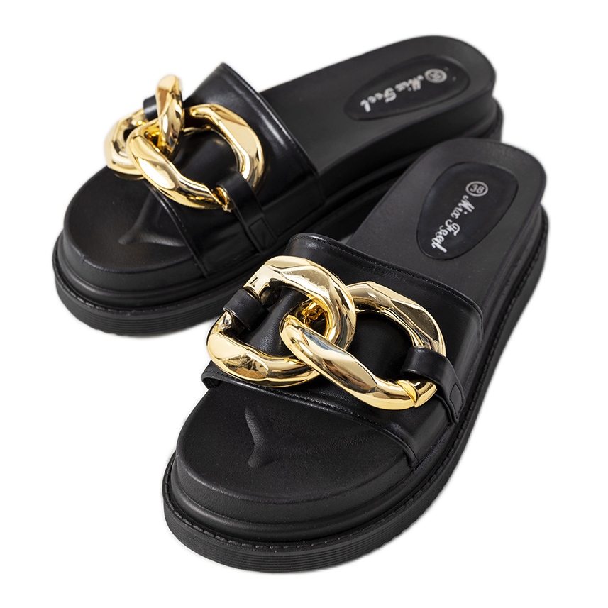 Korkealaatuisesta ekologisesta nahasta valmistetut Berlozin varvastossut yhdistävät modernia muotoilua ja toimivuutta. Pyöreä nenä ja 5 cm korkea alusta takaavat käyttömukavuuden ja klassisen mustan värinsä ansiosta ne sopivat mihin tahansa tyyliin. Lisäetuna on hienovarainen ketju, joka antaa niille alkuperäisen luonteen.