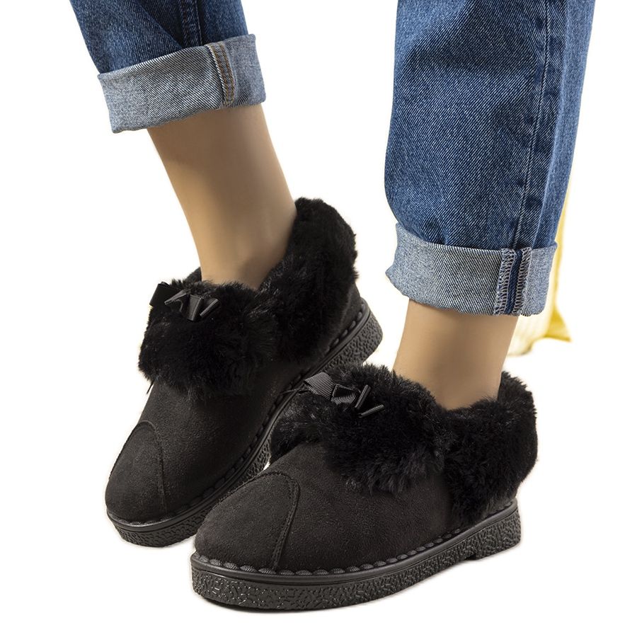 Yksityiskohdat: Mustat tossut, joissa turkiseristetty Valle
