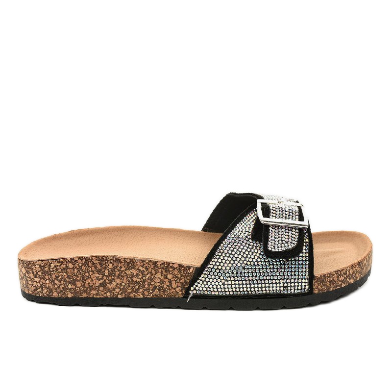 Varvastossujen päällinen on valmistettu korkealaatuisesta ekologisesta nahasta syvän mustan värisenä, mikä antaa niille paitsi klassisen myös elegantin ilmeen. Lisäksi varvastossut on koristeltu hienoilla hopeisilla strassilla ja katseenvangilla soljella, jotka kiinnittävät huomiota ja lisäävät omaperäisyyttä.