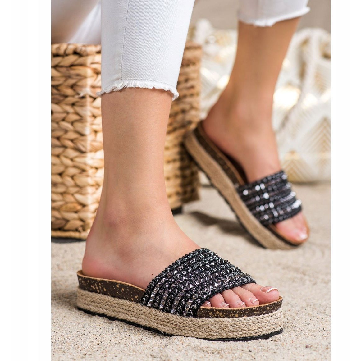 Laadukkaasta tekstiilimateriaalista valmistetut varvastossut näyttävät houkuttelevilta alkuperäisten nastojen ansiosta, jotka antavat niille ainutlaatuisen luonteen. Niiden universaali musta väri tekee niistä helposti yhdisteltäviä eri tyyleihin ja avoin kantapää takaa käyttömukavuuden.