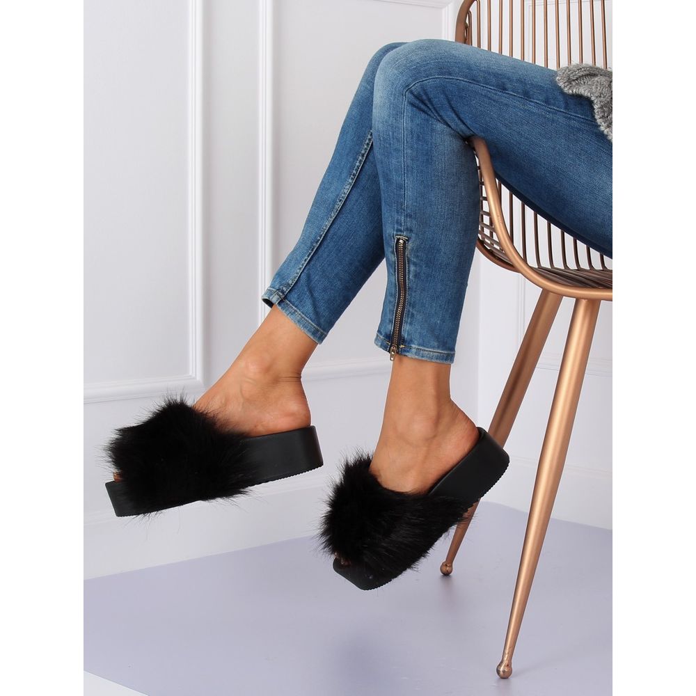 Tyylikkäät naisten tossut pehmeällä turkisilla, täydellinen päivittäiseen käyttöön ja kotiin. Malli 5 cm: n korkealla alustalla profiloidulla pohjalla, mikä varmistaa mukavuuden ja vakauden jokaisessa vaiheessa. Tohvelit ovat hienoja sekä rento tyylien elementti että mukavina kotikenginä.