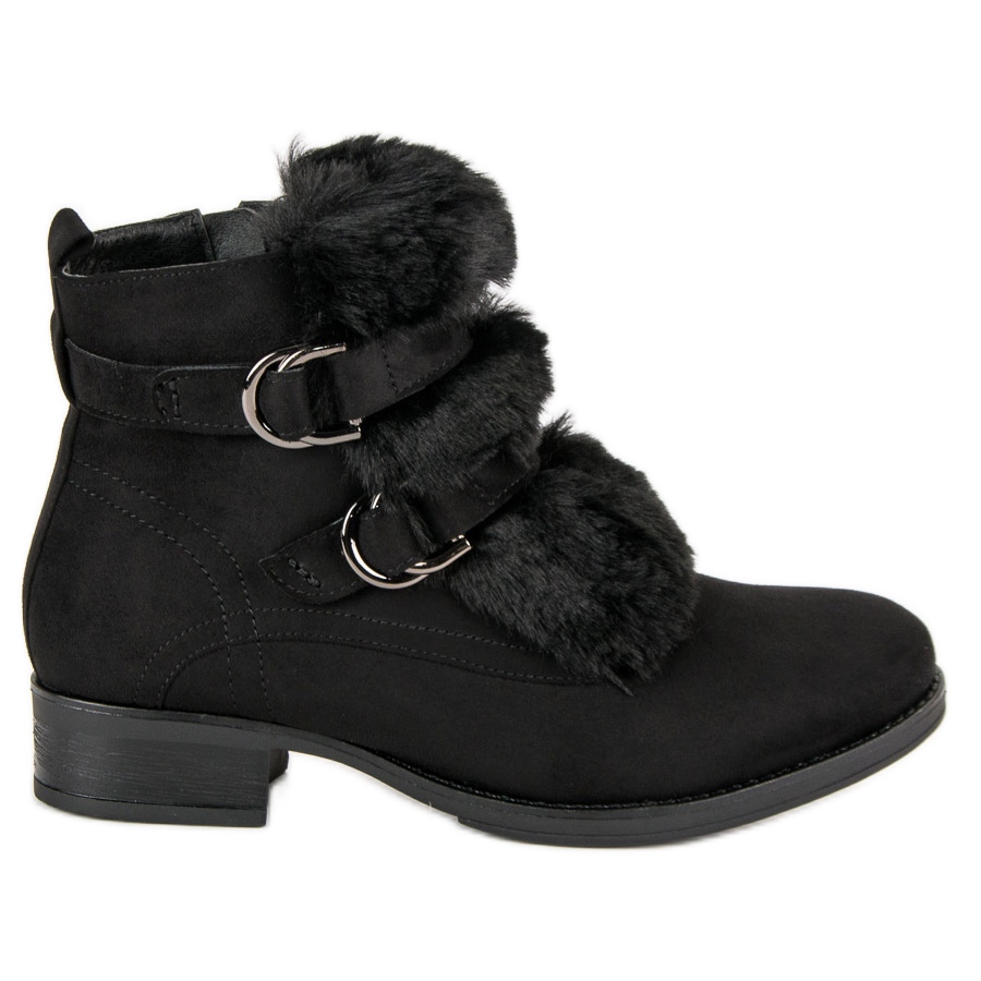Mustat turkissaappaat on pyöreä kärki ja ne kiinnitetään vetoketjulla, mikä tekee niistä helppo pukea ja riisua. Koristeelliset olkaimet hopeisilla soljilla korostavat lisäksi niiden ainutlaatuista tyyliä. Kevyt 3,5 cm kantapää tekee kengistä mukavat käyttää koko päivän ajan tilaisuudesta riippumatta.