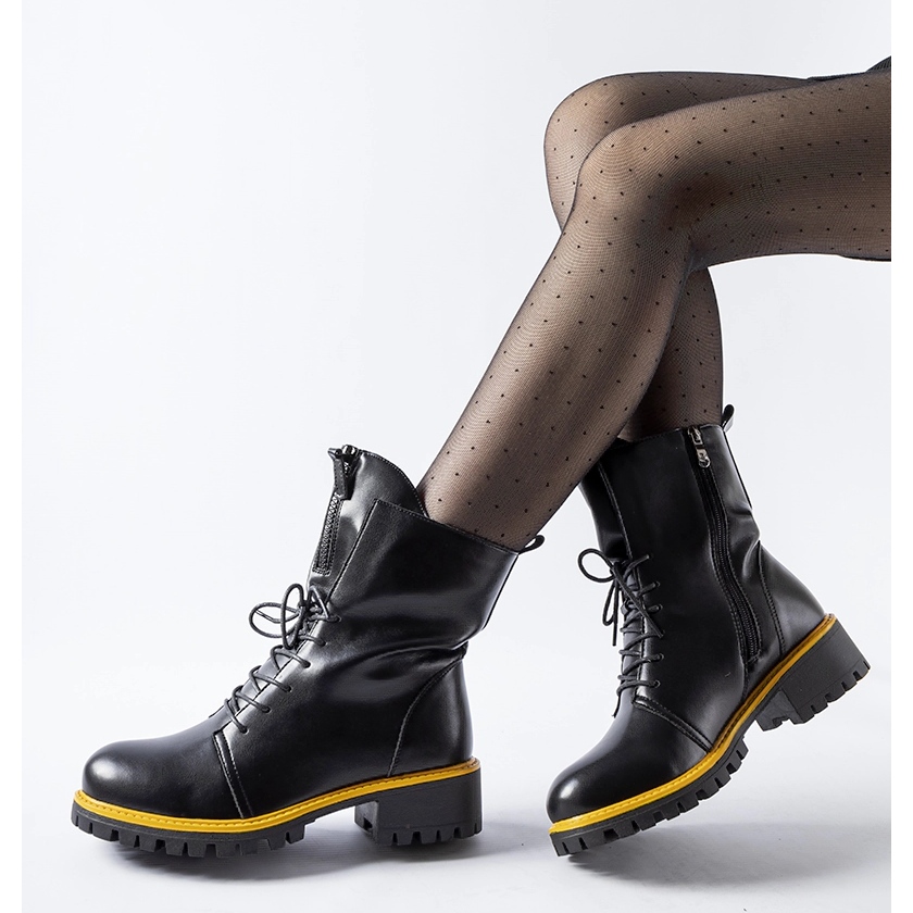 Yksityiskohdat: Mustat työsaappaat keltaisella Elisabetta-koristeella