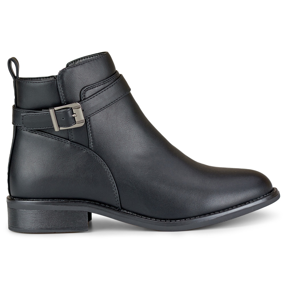 Tyylikkät, ajattomat saappaat, jotka on valmistettu ekologisesta nahasta yleismustalla. Nilkan malli, jolla on yksinkertainen, sileä leikkaus pyöreällä nenällä ja tasaisella pohjalla, tarjoaa tyylikkään ilmeen, jolla on maksimaalinen mukavuus - täydellinen syksy/talvikaudella.