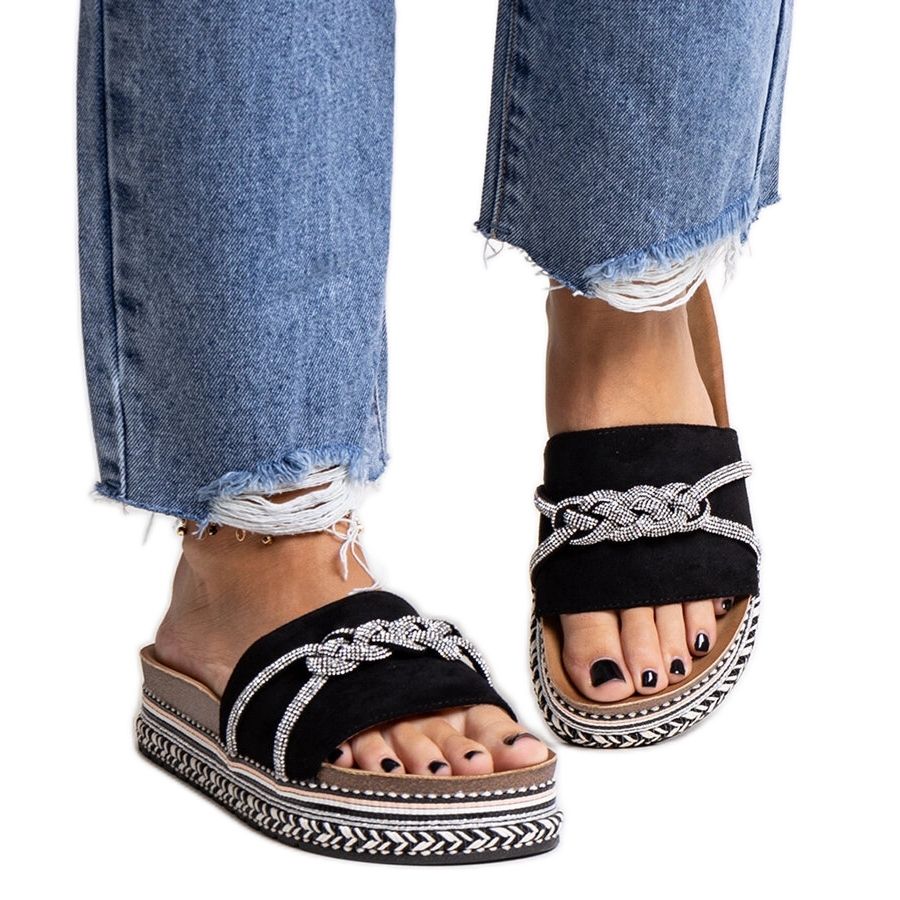 Yksityiskohdat: Mustat varvastossut, jotka on koristeltu Kamiliana-zirkoneilla