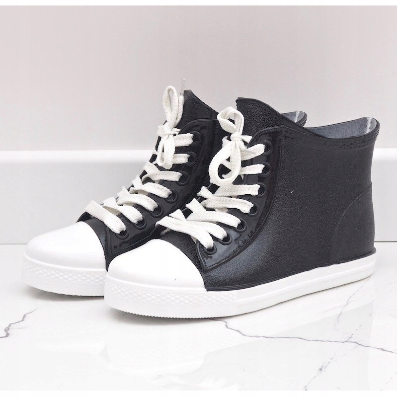 Nämä ainutlaatuiset Wellington-lenkkarit ovat täydellinen valinta naisille, jotka etsivät käytännöllisiä ja samalla tyylikkäitä jalkineita huonoon säähän. Mustat high-top lenkkarit on suunniteltu jäljittelemään klassisten tennarien ulkonäköä, mutta korkealaatuisen kumin ansiosta ne tarjoavat erinomaisen suojan sateelta ja kosteudelta.