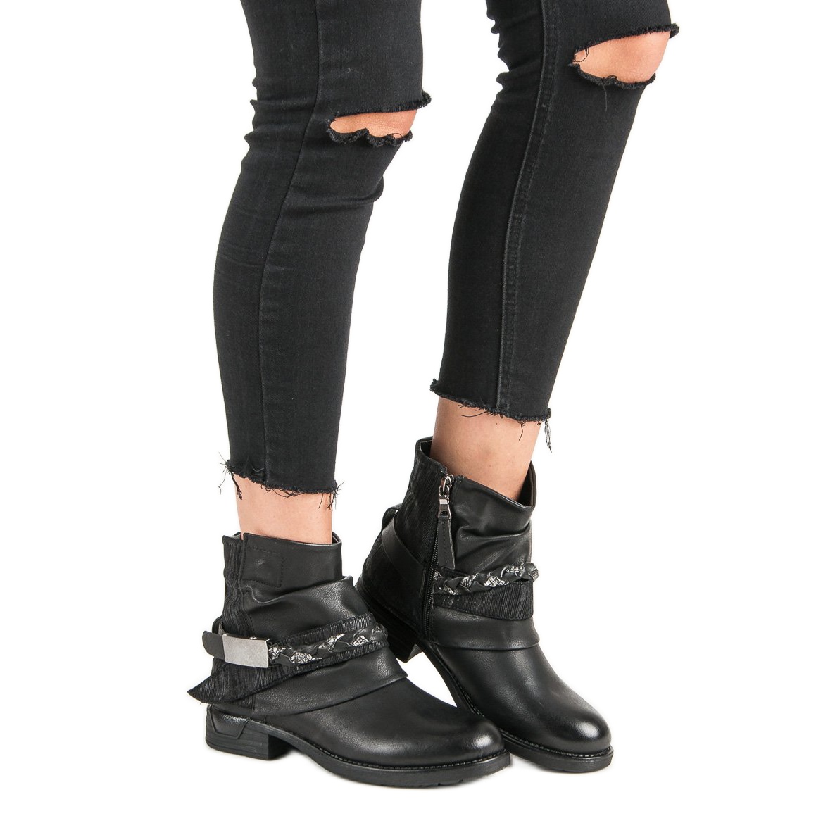 Tämä malli erottuu paitsi toiminnallisuudestaan myös alkuperäisestä suunnittelustaan. Kengän yläosa on rikastettu erilaisilla nahkatekstuureilla, mikä antaa niille ainutlaatuisen luonteen. Lisäetuna on tyylikäs punosvyö koristeellisella soljella, joka korostaa kallion estetiikkaa. Tasainen 3 cm korkea kantapää tekee työntekijöistä erittäin mukavan käytön aikana, täydellinen jokapäiväiseen muotoiluun.