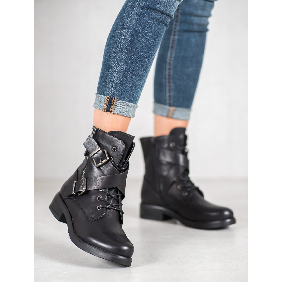 Nilkan yläpuolelle ulottuvat päälliset eivät ainoastaan suojaa kylmältä, vaan myös lisäävät kenkiin eleganssia. Käytännön pitsikiinnityksen ja sivussa olevan koristeellisen vetoketjun ansiosta työntekijän pukeminen ja riisuminen on lastenleikkiä. Soljilla varustetut lisähihnat antavat niille rock-luonteen, joka on täydellinen jokapäiväiseen käyttöön.