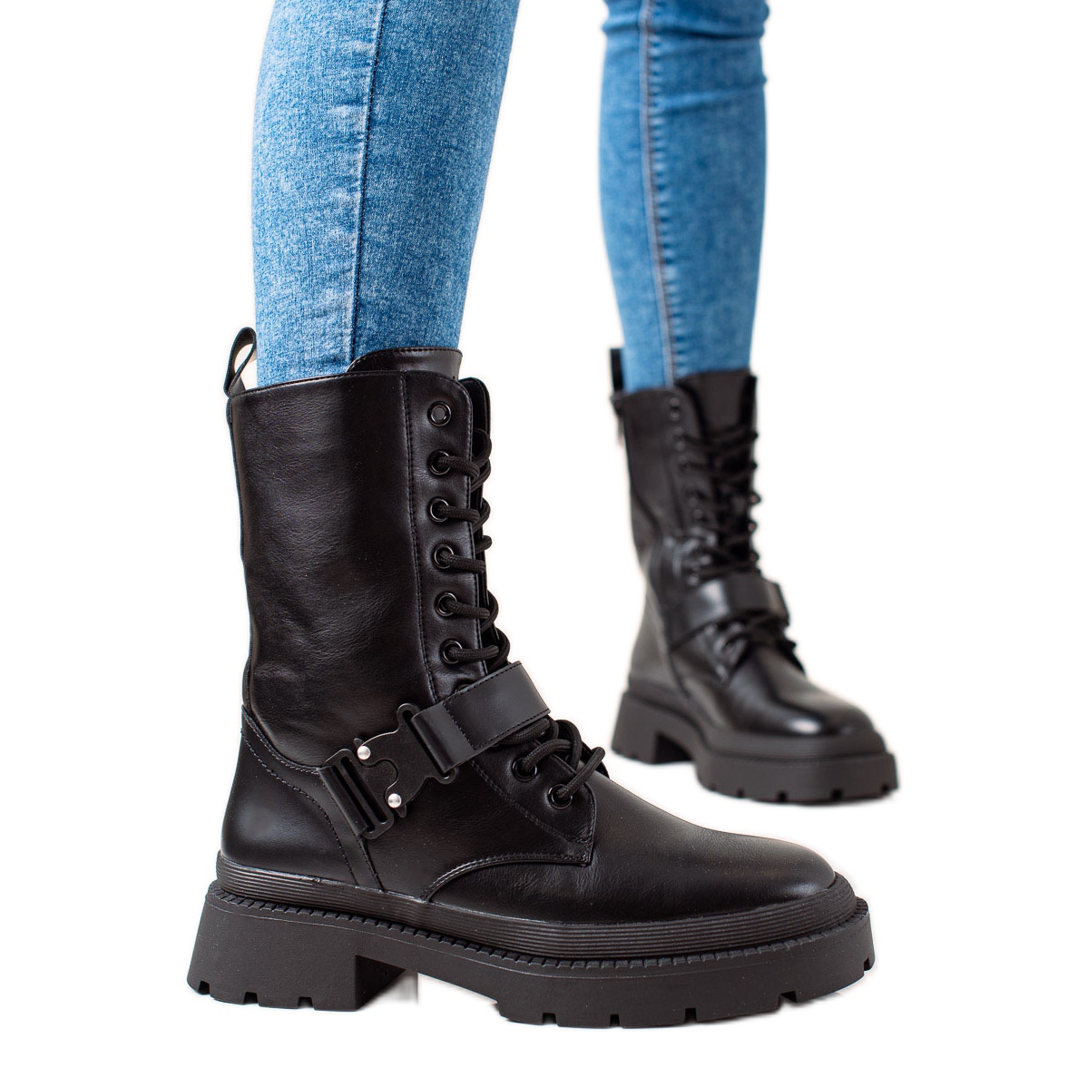 Nämä korkeat saappaat on valmistettu ekologisesta nahasta, mikä tekee niistä paitsi esteettisiä myös ympäristöystävällisiä. Musta viimeistely lisää eleganssia ja koristeellinen solki korostaa niiden ainutlaatuista luonnetta. Sisäpuoli on vuorattu tekstiilimateriaalilla, mikä tekee siitä miellyttävän käyttää koko päivän, ja talvieristys pitää jalat lämpiminä kylmimpinäkin päivinä.