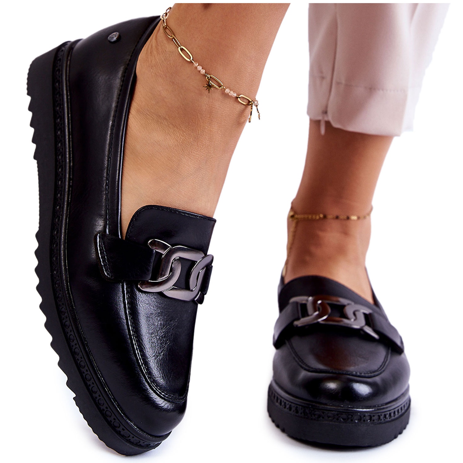 Esittelemme Vinceza Abisso -nahkaiset alustaloaferit tyylikkäässä mustassa värissä, jotka ovat täydellinen yhdistelmä mukavuutta ja tyyliä. Nämä laadukkaasta ekonahasta valmistetut klassiset kengät erottuvat ainutlaatuisesta yksityiskohdasta, joka on koristeellinen ketju edessä, mikä antaa niille ainutlaatuisen luonteen.