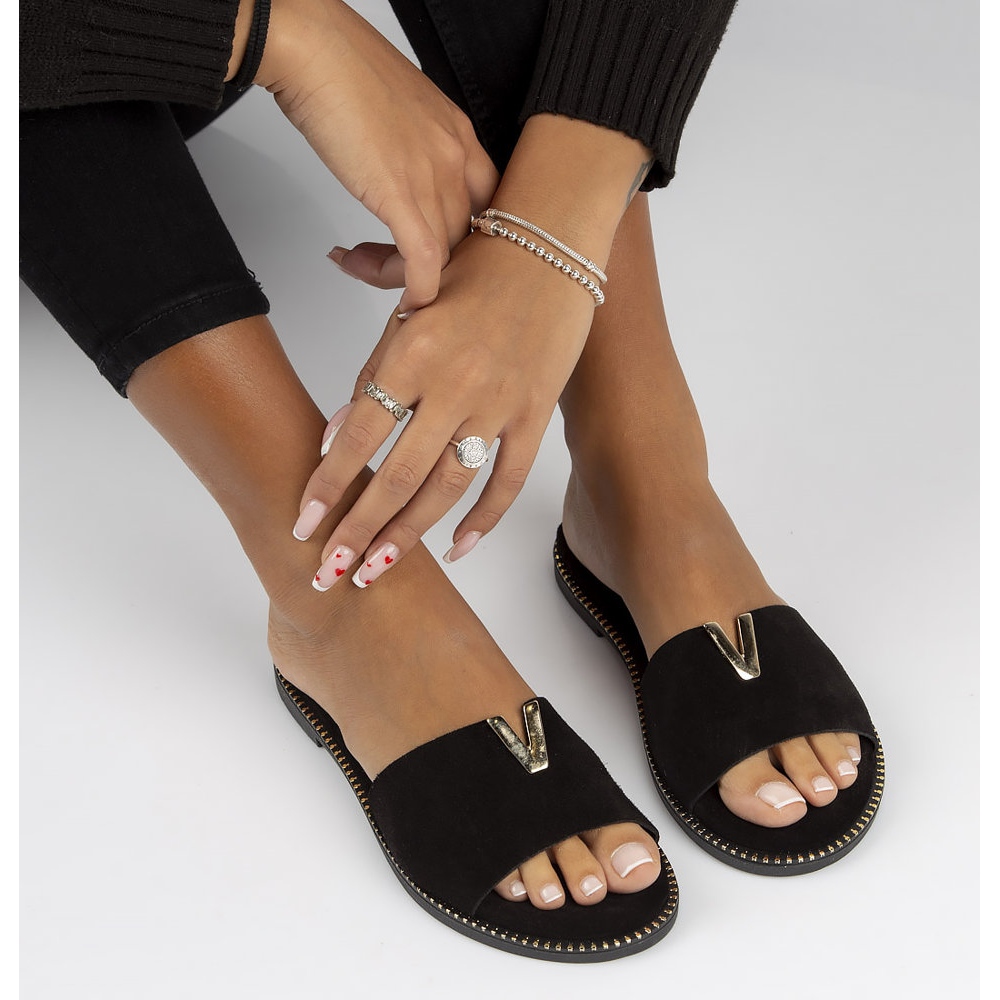 Klassinen musta väri on täydellinen pohja monille kesäasuille - niin mekoille kuin väljillekin housuille. G-leveys varmistaa mukavan istuvuuden, ja varvaslaatikon puuttuminen mahdollistaa jalan liikkumisen vapaasti.