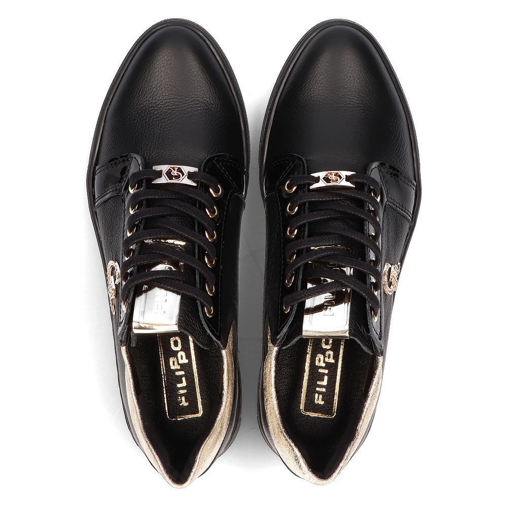 Tässä tyylikkään mustan väriset Filippo 128 -nahkaiset lenkkarit, joissa tyyli ja mukavuus yhdistyvät täydellisesti. Nämä naisten urheilukengät on suunniteltu jokapäiväiseen käyttöön, ja ne sopivat täydellisesti sekä kaupunkityyliin että rentoon asuun.