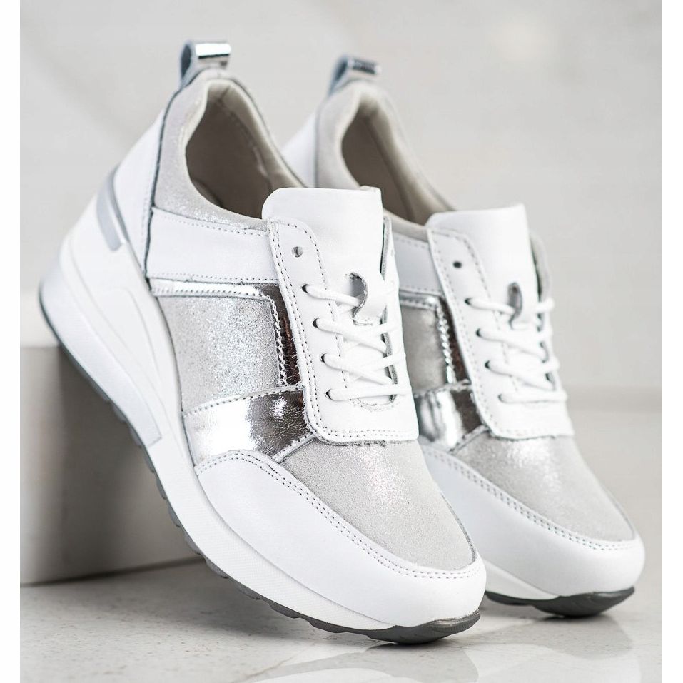 VINCEZA-nahkaiset lenkkarit, joissa on glitteriä valkoisena ja hopeana, ovat jokaisen muodikkaan vaatekaapin välttämättömyys. Näissä Vinceza-brändin allekirjoittamissa vaikuttavissa kengissä yhdistyvät urheilullinen tyyli ja hieman kiiltoa valossa kauniisti hohtavan glitterin ansiosta. Valmistettu korkealaatuisesta luonnollisesta nahasta, ne takaavat täydellisen istuvuuden jalkaan, mikä tarkoittaa jokapäiväisen käytön mukavuutta.