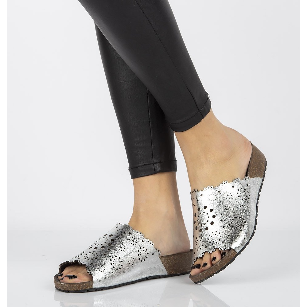 Filippo DK1270/20 Si nahkaiset varvastossut elegantissa hopeanvärisessä on ihanteellinen valinta muotia ja arjen mukavuutta arvostaville naisille. Valmistettu korkealaatuisista materiaaleista, ne takaavat käyttömukavuuden luonnollisen nahkavuoren ja jalan muotoon mukautuvan pohjallisen ansiosta.
