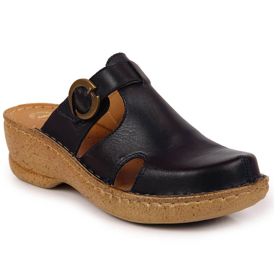 Yksityiskohdat: Nahkaiset tossut sinisellä kiilalla Łukbut 666 laivastonsininen