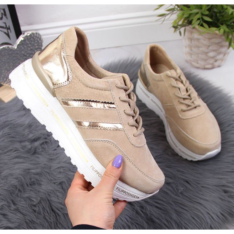 Tyylikkät naisten lenkkarit Filippo Paw328B: ssä yhdistävät klassisen muoto muodikkaan, hieman urheilullisen hahmon kanssa. Luonnonahka ja mukava, 4 cm: n alusta varmistaa mukavuuden koko päivän, ja Universal Beige -väri toimii sekä rentoina että tyylikkäimmissä tyyleissä.