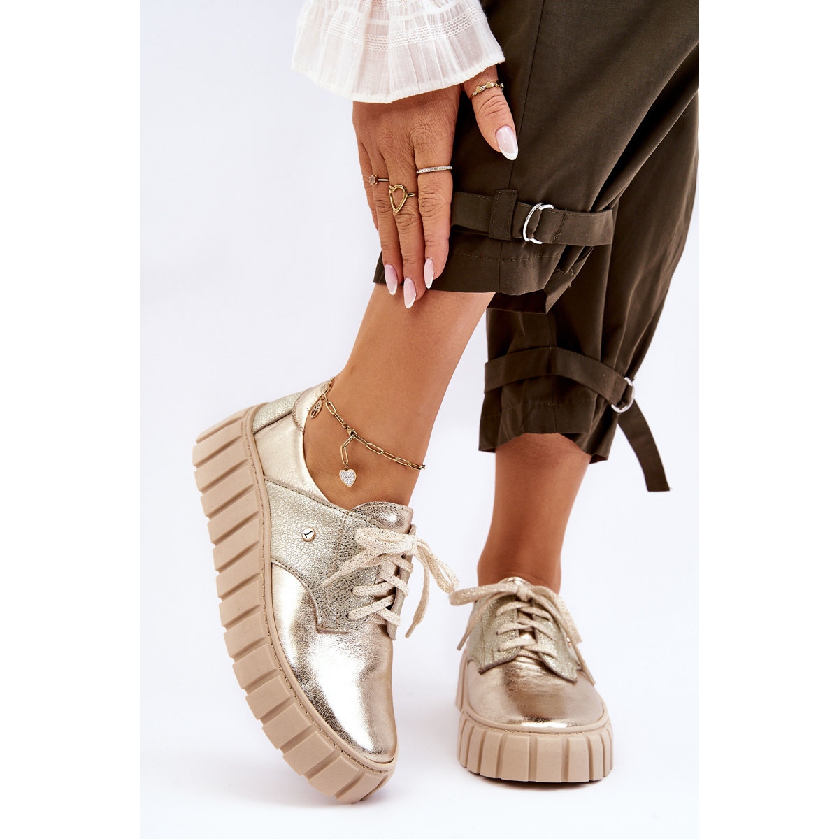 Lemar -hypnoosin ihastuttavat kengät metallisessa, kultaisessa versiossa ovat ehdotus naisille, jotka haluavat yhdistää mukavuuden muodikkaaseen ilmeeseen. Valmistettu luonnollisesta nahasta, tehokas, metallinen viimeistely, asennettu massiiviselle alustalle, jonka korkeus on 4,5 cm, ja sivuilla on ominaisia uria. Klassinen, pyöreä nenä ja nauhoitus, joka on koristeltu kiiltävällä langalla, lisää kenkiin hienovaraisen tyylin.