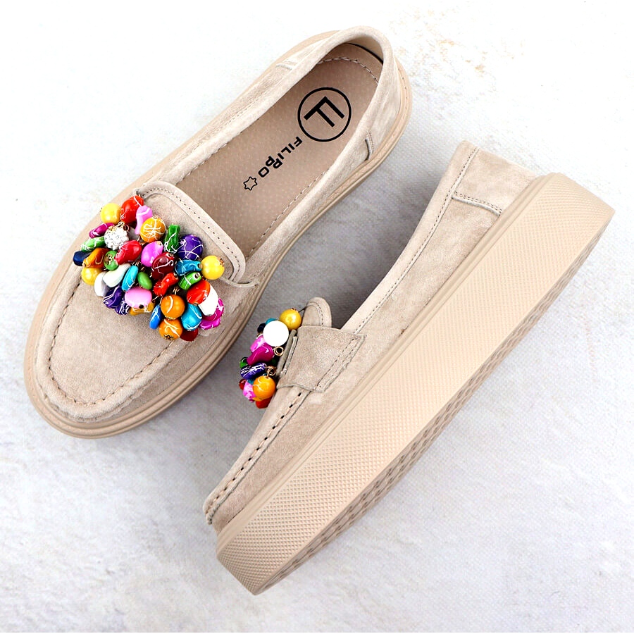 Nahkapäälliköt beige beige filippo dp6765: n kanssa on loistava ehdotus naisille, jotka haluavat yhdistää mukavuuden muodikkaasta ilmeestä. Valmistettu korkealaatuisimmasta luonnollisesta mokkanahasta, nämä kengät eivät vain näytä tyylikkäältä, vaan ovat myös kestäviä ja mukavia.