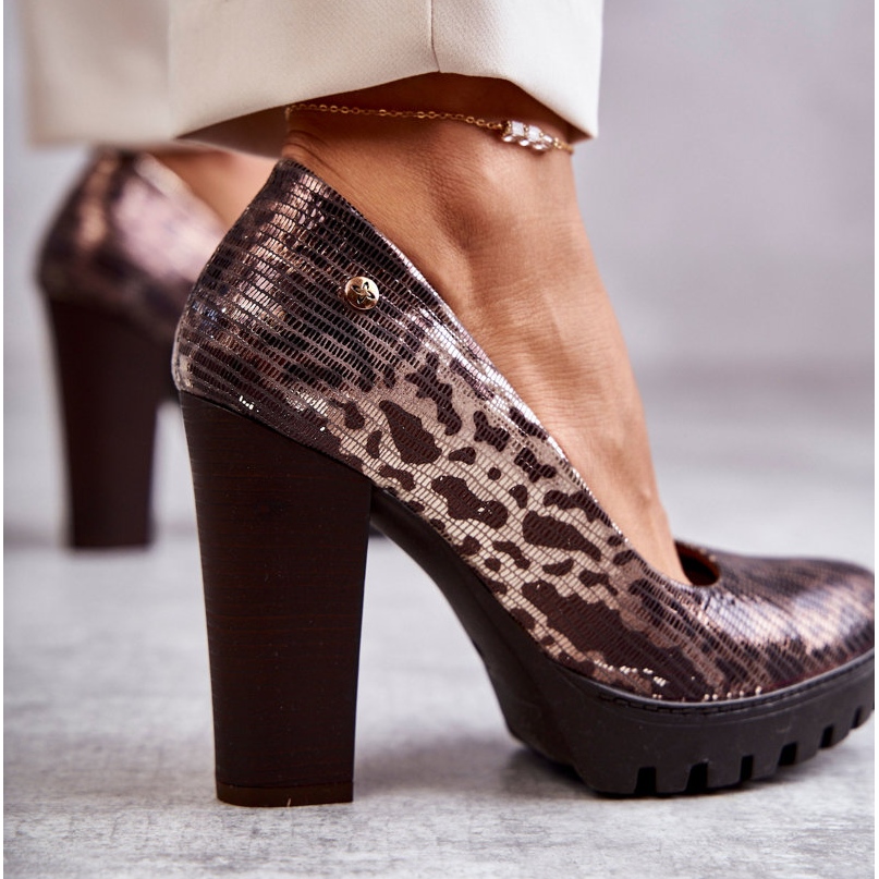 Tyylikkät Maciejka -pumput, jotka on valmistettu käsin Puolassa korkealaatuisimmasta luonnonahasta. Klassinen leikkaus mantelin varpalla ja vakaa 10,5 cm: n baari antaa hienostuneesta tyylikkyydestä ja varmistaa samalla käytön mukavuuden luonnollisen nahan pehmeän, profiloidun insertin ansiosta. Herkkä eläinmalli ruskean sävyissä lisää luonnetta ja monipuolisuutta - ihanteellinen sekä toimisto- että iltatyylille.